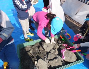 施工場所の近くにある矢島幼稚園の年長さんたちにお越しいただき、高所作業車やミニバックホウの試乗をしたり、工事で出た土や石を触って幼稚園の土との違いを感じてもらったりしました。